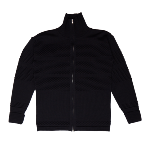 High neck full zip variant of the fisherman sweater. In production since 1948. Angled sleeves reduce yarn waste and create the signature dropped shoulder. Bubble knit segments are mixed with plain knit. The outside is robust fisherman wool, while the inside features extra fine merino for comfort. Full length RIRI zipper allows for jacket-like wear. Made in Latvia. 7GG fabric fineness (7 needles per inch). 100% pure new wool. - Full length RIRI zipper - Bubble texture body and sleeves - Angled sleeves reduce yarn waste - Robust everyday layer