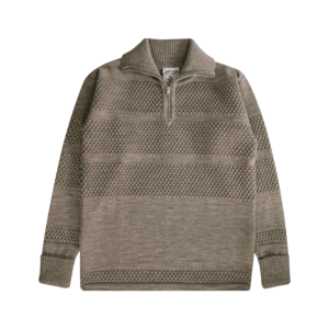 High neck short zip variant of the fisherman sweater. Pattern 1919, in production since 1947. Angled sleeves reduce yarn waste and create the signature dropped shoulder. Bubble knit segments mixed with plain knit. Outside robust fisherman wool; inside extra fine merino. Short RIRI zipper at front. 7GG fabric fineness (7 needles per inch). 100% pure new wool. Made in Latvia.