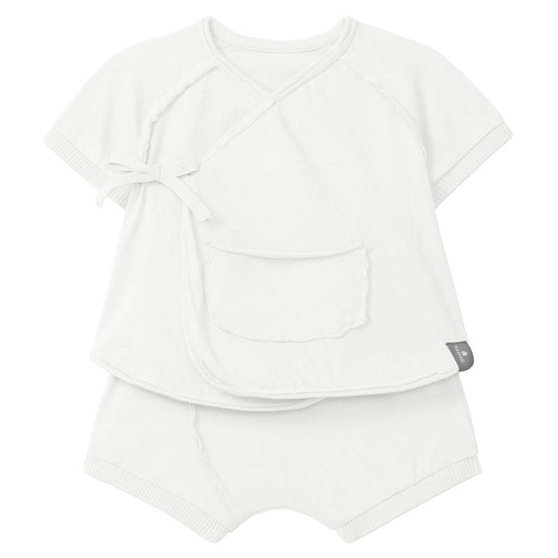 Snug is a consciously designed baby clothing brand from Porto, Portugal. Ethically designed and made in Portugal with a commitment to sustainability by choosing natural materials and reducing waste. - Cotton jersey outfit with raw edge details - T-shirt with a patch pocket on the front, wrap style with tie closures at the sides, and short raglan sleeves with ribbed knit trim - Shorts with an elasticized waist and ribbed knit trim 45% Regenerative Cotton, 44% Organic Cotton, 11% Recycled Cotton Machine wash 40C. Style: 6S131
