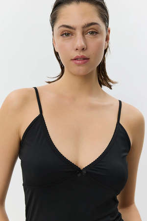 Regular fit camisole with slim straps, a V-neckline, visible stitching, and a small bow in front. Model is 177 cm tall and wears size S. Style no.: S261405 Color: Black Quality: 85% Polyamide, 15% Elastane Fit: Slim fit Washing instructions: 30 gentle wash Type: Clothing