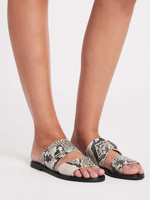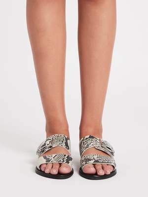 Stay cool in the concrete jungle this season with the Sol Sana Mati Slide in Python. Constructed from a python print leather upper, this open toed slide features thick straps that wrap the foot and are completed with a silver, square buckle closure. FABRIC OR COMPOSITION The Sol Sana Mati Slide in Python is constructed from a leather upper, leather inner and rubber sole. SIZE AND FIT The Sol Sana Mati Slide in Python has an approx. 1cm sole height. BRAND Approachable, yet elevated: these are the elements of great footwear, and Sol Sana have officially perfected the equation. The labels knack for knowing whats cool is revealed in its sleek everyday booties, barely there heels and of-the-moment slides, focusing on quality craftsmanship and premium materials underlines the brands singular attention to detail. Sol Sana mules, boots, and sandals nod to high-end fashion while holding their place as mainstays of a classic modern wardrobe. Sol Sana shoes, boots, and sandals are found in closets of women the world over who want to keep up with the latest trends but dont want to pay a premium for quality footwear. Welcome summer with a pair of coveted Sol Sana slides, or transition into autumn and winter with our carefully curated selection of shoes and boots, available now at Order of Style.