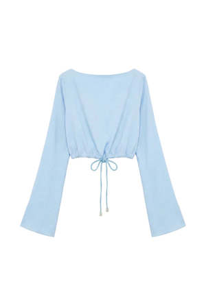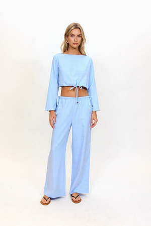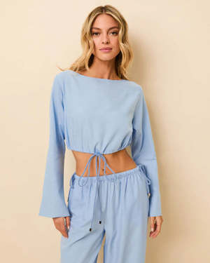 The Chelley Top is an effortless, relaxed pull-on style designed for ease and elegance. Crafted from a premium Tencel blend, this cropped top features a flattering boat neck and long, slight bell sleeves that offer a loose, airy feelperfect for transitioning through warm-weather days. The design is defined by its adjustable rope tie front, allowing you to cinch the waist as desired for a custom fit. Finished with silver-toned cord ends and nautical-inspired rope detailing, the Chelley Top delivers a refined, coastal aesthetic with a modern edge. Pair with the matching wide-leg trousers for a coordinated look. Type: Tops
