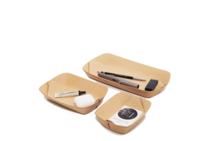 JONGJI Set: A set of leather plates in vegetable-tanned leather. Color: Natural Sizes: - Mini: Approx. 5.5" W x 4.25" H x 1.25" D - Medium: Approx. 5" W x 7" H x 1.25" D - Large: Approx. 5.5" W x 10.25" H x 1.25" D The Jongji set has three different sizes of plates to help keep your small items together and organized. Inspired by paper food packaging, it is fully constructed in Italian vegetable-tanned cowhide using high-end traditional leather craft techniques. Each size is arranged to fit a different purpose: - Jongji Mini: For point cards you dont carry every day or business cards you cannot lose. - Jongji Medium: For small jewelry, lip balm, and keys. - Jongji Large: For pencils and an eraser. Materials: - Shell: Vegetable-tanned cow leather, Conceria Walpier tannery Natural (Italy) - Hardware (keyring): Stainless steel (USA) - Thread: Cotton/poly-blended thread tonal (France) - Edge burnishing agent: Natural beeswax (USA) - Glue: Non-toxic water-based (France) The leather used, called "Buttero leather," is one of the leading products of the tannery Conceria Walpier and is made from vegetable-tanned square shoulders with an aniline finish. Because it is a very natural material, any irregularities and imperfections on the surface of the leather are considered an added value and not a defect. Conceria Walpier tannery in Italy was founded in 1974 and is based in Ponte a Egola, one of the towns belonging to the Tuscan tanning district. In its 40 years of history, Walpier has dedicated itself to the production of 100% vegetable-tanned leathers that have become synonymous with Italian quality and excellence worldwide. Handcrafted in New York City, USA. Notice: This item is fully handmade in our studio. Due to the time-consuming process of crafting, we carry only a very limited number of pieces in stock. In case the item is not available at the time of order, you may still be able to pre-order, and we will contact you with more information about the delivery window. Production time is normally about one to two weeks.