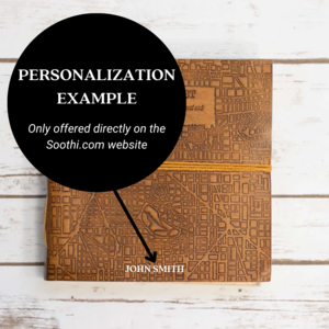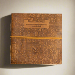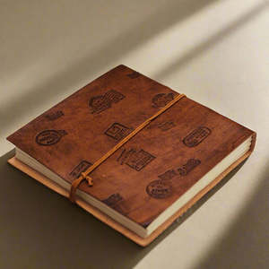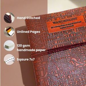 This handmade leather journal is designed for capturing travel notes and creative ideas. Constructed from upcycled leather, the cover features an embossed map grid and the definition of "Wanderlust." The 7 x 7 inch square format and layflat construction offer versatility for use as a sketchbook or guest book. Inside, 100 unlined pages of 120 gsm recycled khadi paper provide a textured surface for writing and drawing. The journal's construction ensures durability, and the upcycled leather offers unique variations in each piece. Details: - 7" x 7" x 1" dimensions provide a compact yet spacious format. - 100 unlined pages of 120 gsm recycled khadi paper are bleed-resistant. - Upcycled leather cover with embossed map grid offers a unique aesthetic. - Layflat design allows for comfortable writing and sketching.