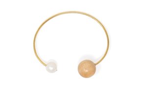 The Pearl Point Bracelet by Sophie Monet is designed with a delicate 16-karat gold plated band. This cuff is finished with a lustrous freshwater pearl and pine wood sphere at each end. Wear it in the evening stacked with similar styles from the collectsion. - Fresh Water Pearl, Pine - 16k Gold Plated Brass