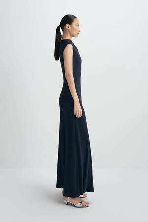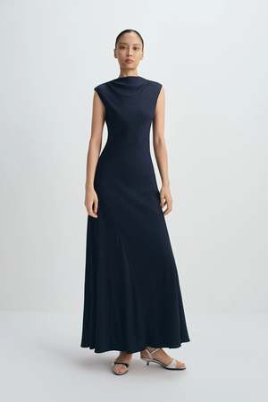 Fabrics: 77% acetate, 23% polyester. Lining: 100% polyester. Fit Guide: Flowy. True to size. Non-stretch. Model is 5'10, 119 lbs, wearing size S. Bust 31.5" / Waist 23.2" / Hips 35.4". Description A fluid maxi dress with a softly draped neckline and clean, elongated lines, offering refined elegance for modern evening simplicity.