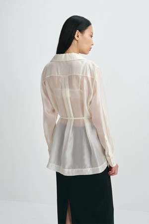 Sheer viscose top with fluid cut and tie waist detail, designed for soft drape and refined silhouette, balancing ease and polish. DETAILS - 76% viscose 24% polyester - Relaxed fit. True to size. Non-Stretch. - Model is 5'10, 119 lbs, wearing size S. Bust 31.5" / Waist 23.2" / Hips 35.4"
