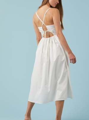 Romantic white poplin dress featuring midi length, cinched waist and open back. Petite white buttons add detail to the waistline and gathered bust cups are edged by a small ruffle. So perfect for spring and summer. Fit + Measurements X-Small: Bust 30"-32" Waist 24"-25" Small: Bust 32"-34" Waist 25"-26" Medium: Bust 34"-36" Waist 26"-28" Large: Bust 36"-38" Waist 28"-30" Measurement taken from size Small Model is 5'4" and is wearing size Small Fabric + Care 100% Cotton Machine was cold. Hang to dry.