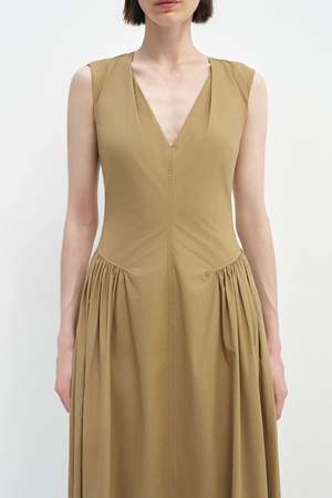 A cotton dress shaped with side gathers and a subtle V-neckline, creating natural structure with effortless movement.