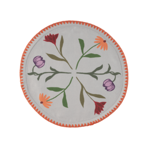 Set of six round placemats featuring the Picnic on the Meadow print with yellow embroidery detail on the seam. Each placemat measures 14 1/2 inches (38 cm) in diameter. Due to their unique shape and fabric, placemats may roll up when unpackaged; this can be rectified with steam or will flatten over time.