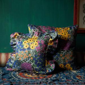 This special pillow cover features hand-illustrated flowers and a charming ruffle detail. Size: Body 14" x 14" (35 x 35 cm), Ruffle 3" (8 cm). Comes without fillers.