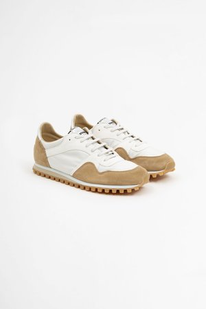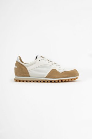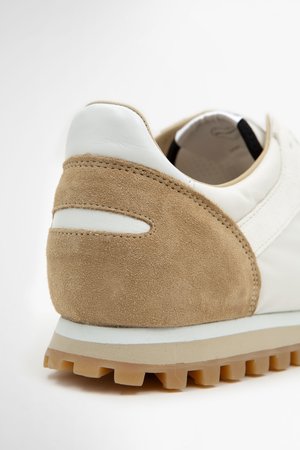 Low-top paneled calfskin suede and nylon canvas sneakers in white and tan. Round toe. Lace-up closure in grey. Logo patch in white and black trim at padded tongue. Padded collar. Buffed calfskin heel tab in white. Leather and mesh lining. Foam rubber midsole colorblocked in white and beige. Treaded rubber outsole in tan. Made in EU