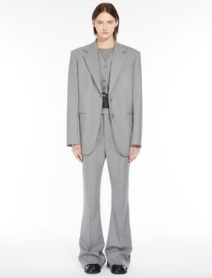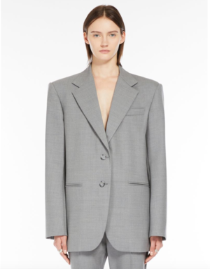 Sportmax's Baffo is an oversized loose-fit blazer in stretch woollen cloth. The comfort-fit model boasts constructed shoulders, a tailoring-style lapel collar and a central two-button fastening. The double-welt side pockets and central rear vent complete the garment. Product Details Designer ID: SP2046034206016 Color: Light Grey Composition: 100% virgin wool; lining 70% acetate, 30% polyester; sleeves lining 97% viscose, 3% acetate Made in Italy