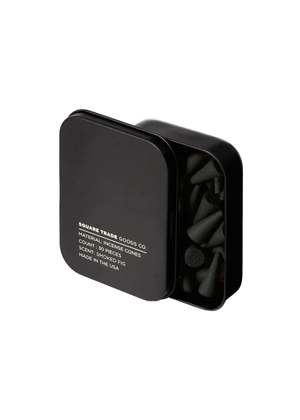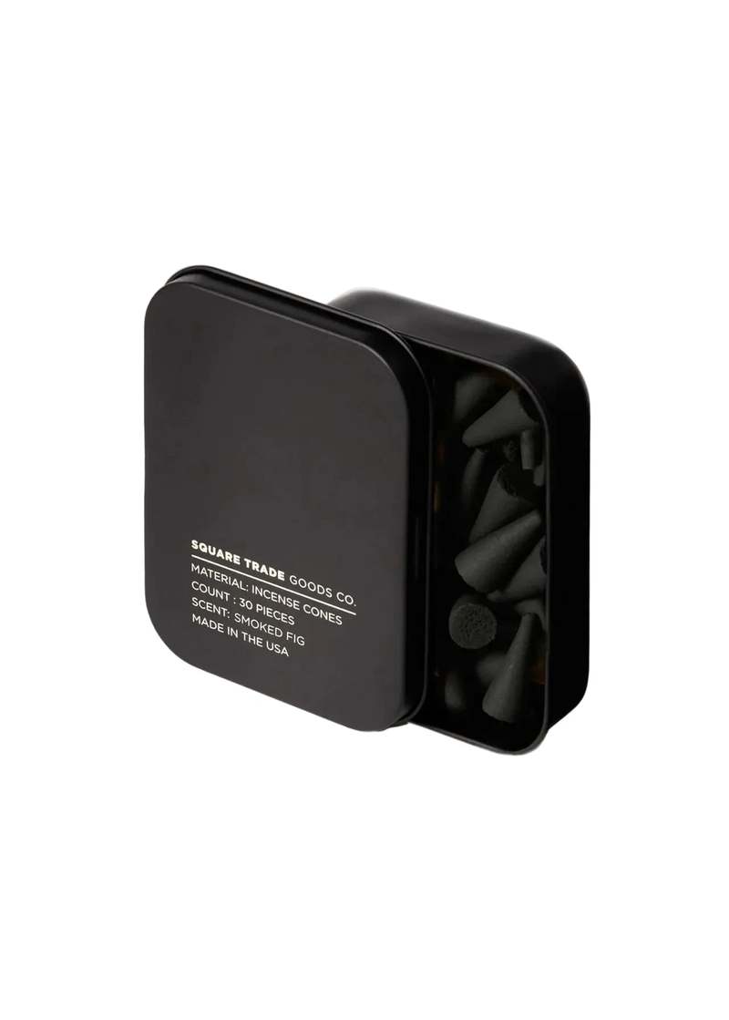 The Smoked Fig scent in incense cones from Square Trade Goods Co. Details Notes: Cardamom, white pepper, fig leaves, sandalwood, cedar wood, and smoked amber. - 30 incense cones per tin - Lid is a suitable burning surface - 20 minute burn time - Scent longevity: 2 to 4 hours - Hand dipped in Richmond, VA - Made in the U.S.A.