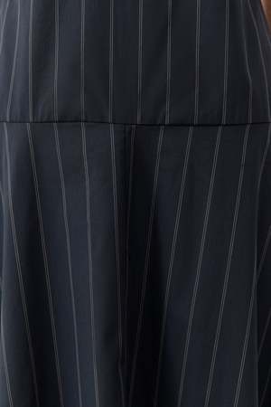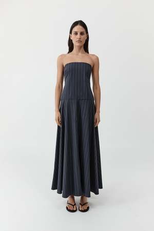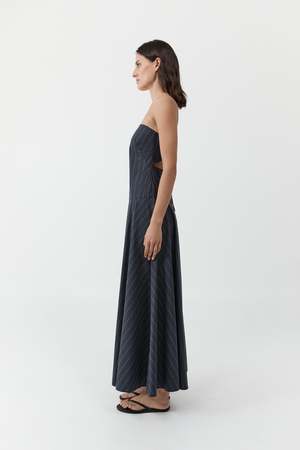 The Strapless Rouleau Dress is crafted from a breathable blend of cotton and recycled nylon, featuring a fitted strapless bodice that falls into a relaxed, full circle skirt at a maxi length. An open back is balanced by a delicate rouleau tie with button fastening. Refined and fluid, the Strapless Rouleau Dress offers an understated approach to modern occasion dressing. Color: Ink Stripe Fabrication: 66% Cotton / 31% Recycled Nylon / 3% Elastane Fit Notes: True to size