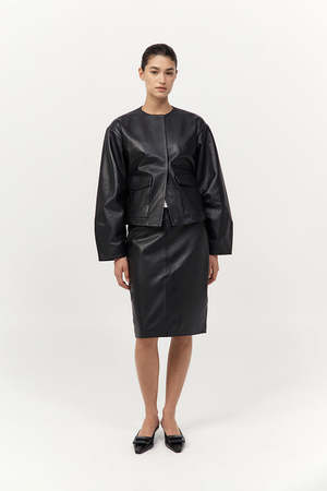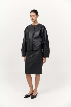 The Utility Cocoon Leather Bomber offers a sleek, contemporary take on utilitarian outerwear. Crafted from supple 100% lambskin and lined with 100% TENCEL Lyocell, it features a collarless crew neckline and relaxed cocoon silhouette. Front, back, and sleeve darts lend subtle structure, while concealed magnetic buttons complete the streamlined finish. MATERIAL Outer: 100% Lambskin Leather, Lining: 100% TENCEL Lyocell COLOR Black ORIGIN Responsibly made in India CARE Natural Leather Protector is recommended before wear. Use a good quality leather conditioner or protective spray to treat the product to increase its durability. Regularly clean leather with a soft brush or cloth, regularly air out leather, and where possible do not get leather wet. Blot away water or moisture as soon as possible, do not immerse leather in water to clean.