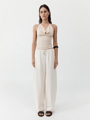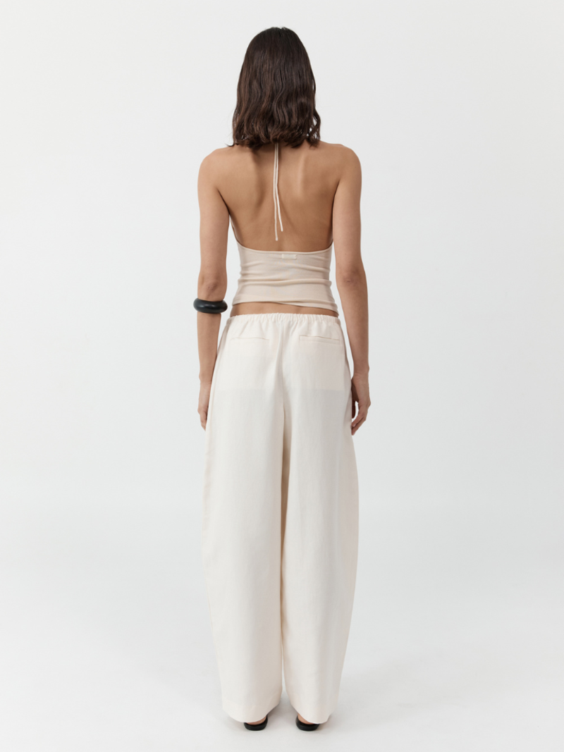 The Fine Drawstring Relaxed Pants balance function with ease. Cut with a relaxed wide leg and thin elasticated waistband, these pants are crafted from an organic cotton and linen blend, offering a gentle, breathable feel against the skin. An understated essential designed for pared-back, everyday dressing. Materials - 77% Organic Cotton / 23% Linen - Organic Content Standard (OCS) Certificate - European Flax Garment Details - Mid rise, straight leg, elasticated waistband with drawcord, side seam pockets, back welt pockets, unlined - Relaxed fit Manufacturing - SMETA Sedex Ethical Audit - OEKO-TEX Standard 100 Certification - Manufacturer has signed the St. Agni Code of Conduct - Responsibly made in China Model wears size XS Height: 178 cm (510) Bust: 80 cm (31) Waist: 60 cm (23) Hips: 89 cm (35) Centimeters / Inches Size (in) XXS XS S M L XL Waist 27.6 28.5 30.5 32.5 34.4 36.4 Hip 40.2 41.1 43.1 45.1 47 49 Hem 19.2 19.5 20.2 20.8 21.4 22 Outer Leg Length 40 40.1 40.3 40.6 40.8 41 Front Rise 10.4 10.6 11 11.4 11.8 12.2
