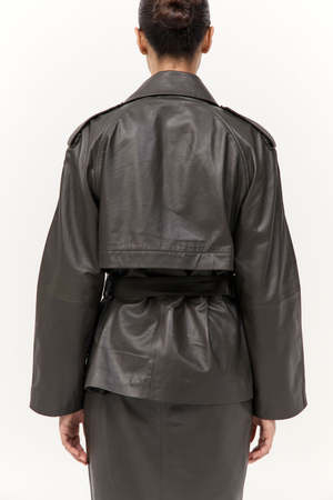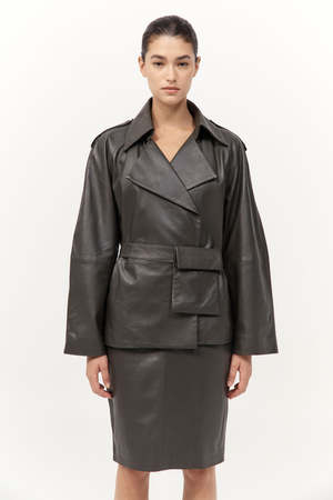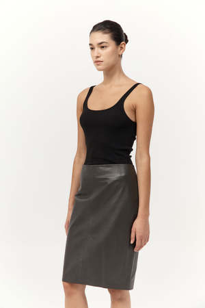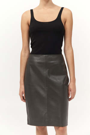 Sleek and timeless, the Leather Pencil Skirt is designed for a close, flattering fit. Crafted from supple 100% lambskin and lined with 100% TENCEL Lyocell. Designed with a mid-rise waist, knee-length hemline and subtle back darts for shape, the Leather Pencil Skirt balances edge with elegance. Fabrication: 100% Lambskin Leather Color: Khaki