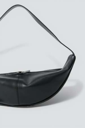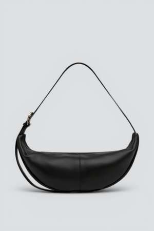 Black adjustable slim crescent shoulder bag from St. Agni. Crescent-shaped shoulder bag with soft lambskin leather body, adjustable shoulder strap, goatskin suede lining, and custom St. Agni zipper closure. Exterior: Lambskin. Lining: Goatskin suede. Made in India.
