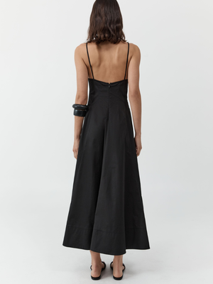 The Structured Cotton Dress is a timeless silhouette, cut to a flattering 7/8 length with a relaxed fit. Featuring a clean V-neckline with bust darts for subtle shaping and thin straps that frame the dcolletage. Thoughtful panel detailing enhances the structure of the full circle skirt, creating natural movement through the body. Made with 51% Organic Cotton / 46% Cotton / 3% Elastane.