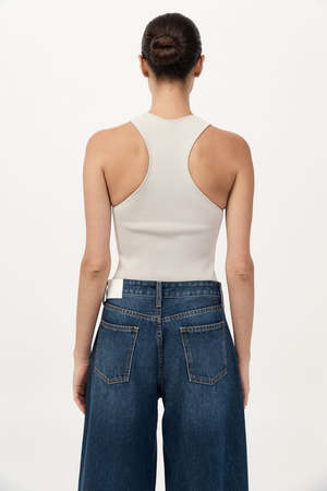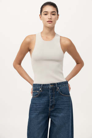 The Sculpted Knit Top features a sleek tank silhouette with a crew neckline and clean, sleeveless finish. Shaped with subtle contouring, it offers a refined base layer or standalone piece, crafted for ease and structure in equal measure. Color: Silver Fabrication: 68% FSC Viscose / 32% Recycled Nylon Fit Notes: True to size