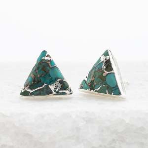 Our Ellie Triangle Turquoise Studs feature natural turquoise stones woven together and wrapped in vibrant, shining sterling silver. The natural stones and playful triangle shape make the Ellie Studs the perfect combination of organic and modern, wearable anywhere from a night out with friends to a soccer game. When you purchase or gift the Ellie Stud Earrings, you help provide safe housing for women escaping exploitation and experiencing freedom at Starfish Project. Each pair is unique due to the one-of-a-kind nature of the silver inlay, the exact pattern may vary from the image shown. Materials: Silver plated natural turquoise earrings. Hypoallergenic; lead and cadmium free with nickel content less than 100 ppm. Size: 0.39 inches.