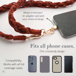 The Terra Cotta Macram Crossbody Strap brings warmth, texture, and impact to your everyday carry. Handwoven, this earthy, rust-toned strap is a stunning way to transform your phone or small handbag into a hands-free style statement. The rich Terra Cotta shade adds a bold, natural touch to any outfit, making it both practical and beautiful. Designed for versatility, the easy clip-on feature and included adapter card make it compatible with all full-coverage phone cases. It is a convenient length for texting, taking photos, and comfortable wear. Whether youre gifting it to a loved one or treating yourself, this handwoven strap carries a deeper meaningits a symbol of resilience and the journey to a brighter future. Each purchase helps support survivors as they gain skills, confidence, and independence. Whats in the box: Each set comes with an adapter card and strap. Box size and color may vary. Materials: Hypoallergenic; lead and cadmium free with nickel content less than 100ppm. Size: 48 inches.