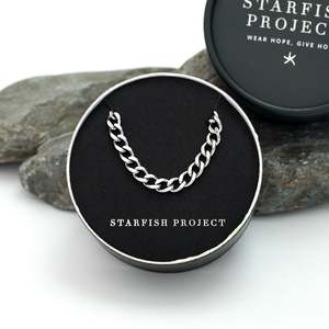 The Linked Curb Chain Necklace is a classic piece designed for everyday wear. Style it solo or double upeither way, it makes a strong impact. The sleek stainless steel links represent strength and connection, and the 6 mm chain features the Starfish Project signature starfish icon hinge closure to complete any look with minimal effort and maximum impact. Sweat, water, and heat proof. No green skin and hypoallergenic. Materials: Stainless steel necklace; hypoallergenic and lead- and cadmium-free with nickel content less than 100 ppm. Size: 19.5 inches. Box size and color may vary.