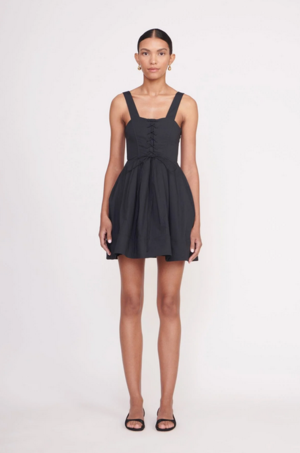 Color: Black 98% Cotton, 2% Spandex Fit: True to size | Babydoll style dress with lace up corset | Model is 5'10" and wearing a size 2 Care: Dry clean only