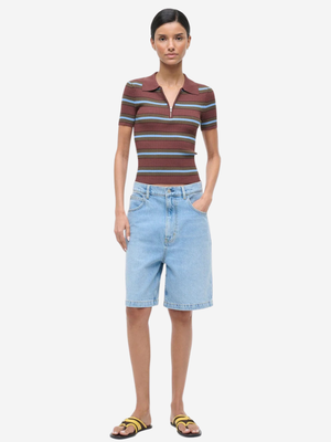 The Ren top by Staud is a tailored knit polo featuring a classic stripe pattern. It has short sleeves and a fitted silhouette, perfect for layering or wearing solo. Product Details: - Designer ID: R26S3132VN - Color: Redondo Stripe - Composition: 65% Viscose, 35% Nylon - Imported.