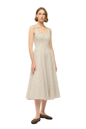 The Wells Dress by Staud features a square neckline and a corset-inspired paneled bodice for a flattering, fitted shape through the waist. Made from lightweight cotton poplin with a center back zipper. Designer ID: R26R2305SP Composition: 98% Cotton, 2% Spandex.