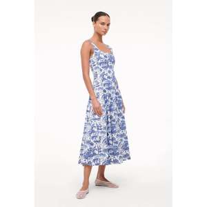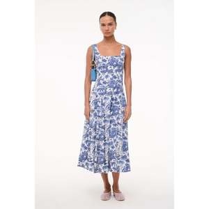 The Wells Dress features a corset-style panel construction to create a flattering, fitted shape through the waist and a full skirt that hits just below the knee. Constructed in lightweight cotton poplin.