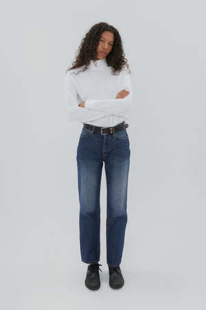 Still Here slim straight leg Childhood jeans in medium indigo Bruce wash. Inspired by the "anti-fit" simplicity of your favorite childhood jeans. It's a relaxed leg, slightly tapered, super hi-rise, wedgie fit. It features a traditional button fly and our signature 'SH' embroidery. The Childhood is our original cool-girl jean. 100% Cotton. Measurements: waist 24.75", hip 36", rise 10.75", inseam 30", leg opening 15". CH-BRUCE-OG