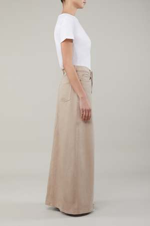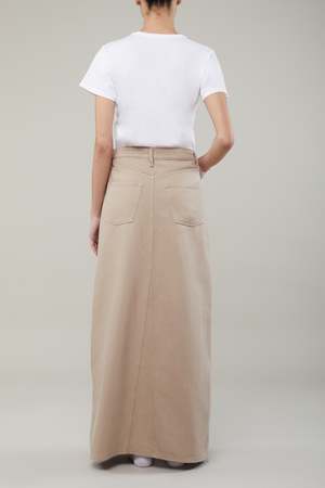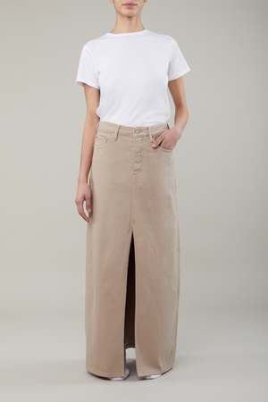 The Lima Skirt is inspired by denim in the 90's. The Lima is an A-Line Maxi Skirt in full-length that has an exaggerated front slit. It features a traditional button fly and our signature 'SH' embroidery. Our best-selling skirt is now available in Khaki.