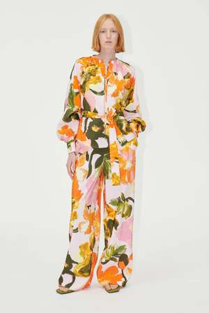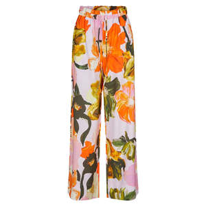 A pair of flowing high waisted pants with a ruched drawstring waist, wide leg silhouette and bright floral pattern. Made by Stine Goya in Italy CONTENT & CARE: 100% Ecovero Viscose / Hand Wash