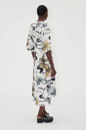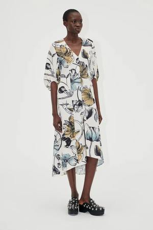 V-neck midi dress with puffed 3/4 length sleeves, pockets, and a delicate fineline floral pattern. 96% Recycled Polyester / 4% Elastane Machine Wash Size S: Chest 92 cm / Waist 80.4 cm / Hip 103.8 cm / Length 122 cm Size M: Chest 96 cm / Waist 84.4 cm / Hip 107.8 cm / Length 123 cm