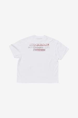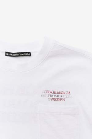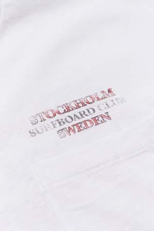The Pocket Tee Stockholm from Stockholm Surfboard Club is a garment-dyed pocket t-shirt in white with screen prints at the chest and back, cut in a boxy unisex fit. Waist length with a ribbed collar and a vintage-wash dye, its the kind of graphic staple that works on its own or layered under an overshirt. Style code: U1000276.