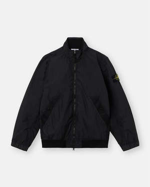 Stand collar jacket in a light recycled nylon rep with an ultra-tight weaving construction. The resin coating on its inner face makes it wind resistant and mildly water resistant. Due to the resin treatment of the material, the color penetrates unevenly, lending a crinkled appearance to the surface. Garment dyed with the addition of a special anti-drop agent. Stand collar with ribbed lining and tape trim along back. Angled welt hand pockets with tape trim and snap. Back yoke. Stone Island badge on left sleeve. Elasticated cuffs. Ribbed bottom band. Two-way zipper fastening. Garment dyed Inner resin coating Anti-drop finish Main: 100% Polyamide/Nylon Coating: 100% Polyurethanic Resin ribbings: 95% Polyamide/Nylon, 5% Elastane/Spandex Lining: 100% Polyamide/Nylon Made in Indonesia. Style No. L1S15 4100111 V0029 Type: Outerwear