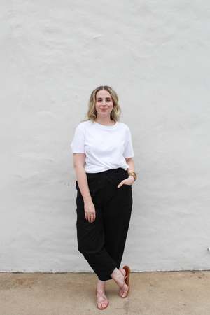A new, fresh brand on the market, Story keeps casual sophistication at the front of mind. A California-based brand designed and manufactured in downtown Los Angeles with luxurious everyday fabrics and sleek, chic shapes. - Color: Navy - Material: Cotton - Elastic Waist, two front pockets - Machine wash cold, hang to dry - Designed and made in Los Angeles