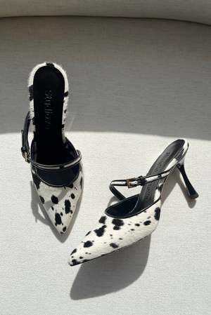 The Alto 90 Mule is a sculptural pointed-toe silhouette defined by an elongated profile and a shallow curved topline. Featuring tubular leather piping trim and an asymmetrical strap that creates fluidity in the structure, it is finished with a statement gold square buckle. Crafted from printed Dalmatian calf hair and finished with a lacquered undercut 90 mm heel, the Alto 90 Mule is an elegant statement heel designed to elevate your outfit, perfectly balancing refined style with bold impact. Color: Dalmatian Fabrication: Leather / Calf Hair Type: Shoes