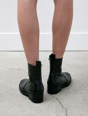 Rugged moto-inspired boots with a side-zip closure in a smooth black calf leather with a soft matte finish. Sleek minimal lines offer a highly versatile silhouette that can be dressed up with a maxi skirt or worn with denim for a classic everyday look true to the DNA of the moto style. Completed with Blake stitched construction at the footbed, a stacked leather heel, and a durable, long lasting Vibram outsole.