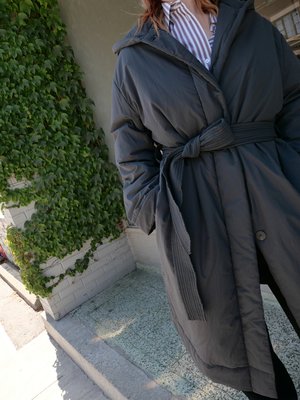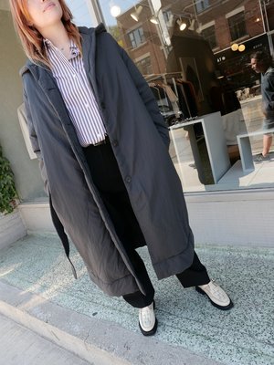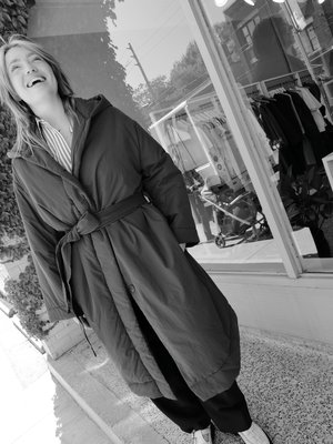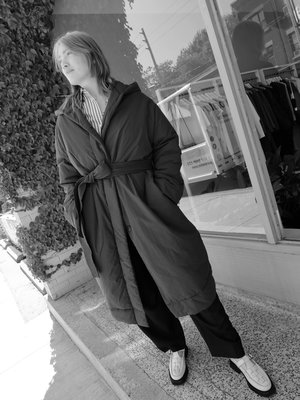 STUDIO NICHOLSON KARIBA COAT IN BLACK. CONSTRUCTED FROM A POWDER-COATED PARACHUTE NYLON, AND FILLED WITH ECODOWN FIBRES FOR SUPERIOR HEAT RETENTION. FEATURES HOOD AND BELT, ADDING SHAPE TO THE COAT'S VOLUMINOUS SILHOUETTE. FASHIONED WITH SIDE SEAM POCKETS AND CONCEALED FRONT PLACKET. (shell: 100% polyamide, filling: 100% recycled polyester, lining: 95% polyester, 5% elastane) - Lily is 5'10 with a 30 inch waist, a 37 inch bust, and a 39 inch hip, and is wearing the size 1.