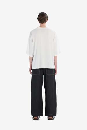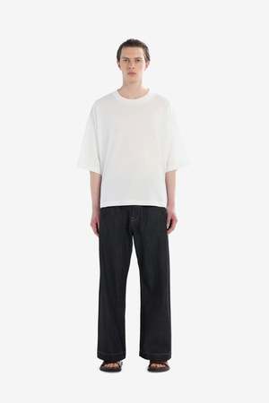 Studio Nicholson’s founder Nick Wakeson says she begins with the end in mind as she carefully pours over every detail of the textiles’ behaviors to create oversized silhouettes and luxurious pieces that fall beautifully.