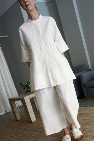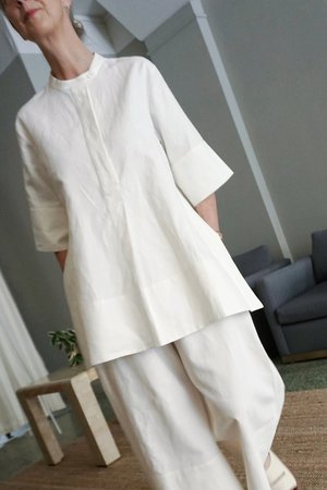 STUDIO NICHOLSON SUMA SHIRT IS A SUMMER ESSENTIAL WITH A MINIMALISTIC YET UNIQUE SILHOUETTE. MADE FROM A MODERN COATED LINEN, THIS PULLOVER SHIRT HAS A STRUCTURED AND LONG-LASTING FEEL WHICH WILL SOFTEN WITH WEAR. DETAILS INCLUDE ELBOW-LENGTH SLEEVES WITH BUTTONED CUFFS, A CONCEALED HALF-PLACKET BUTTON FRONT, AND BANDED COLLAR. THIS STYLE ALSO FEATURES DEEP SIDE SLITS AT THE HEM AND AN INVERTED PLEAT AT THE BACK YOKE. THE SHIRT MEASURES APPROXIMATELY 32 INCHES IN LENGTH. MADE IN PORTUGAL. (100% linen) - Rachel is 59 with a 36 bust, 30 waist and 37 hip, and is wearing the size 1.