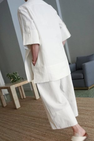 Studio Nicholson’s founder Nick Wakeson says she begins with the end in mind as she carefully pours over every detail of the textiles’ behaviors to create oversized silhouettes and luxurious pieces that fall beautifully.