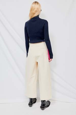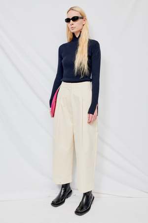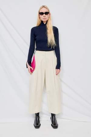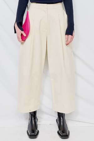 High waisted volume pant with deep front pleat in a peached cotton twill. Details include one deep pleat at front, two side pockets and two single jet pockets at back. - 100% Cotton - Rachel is 5'10 and wears a size 2, shown in size 0