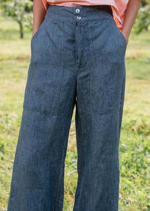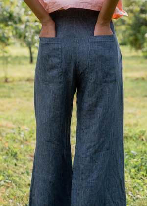 Sula's Flare Pants are cut from a soft Japanese linen with a twill weave and can be machine washed. These pants feature a 70's inspired flared leg with a loose fit in the thigh, a flat front with a wide waistband, a mid-rise waist, two side pockets, two back patch pockets, and a button fly closure. Size small measures: - Waist: 78cm / 30 3/4 - Hip: 96cm / 37 3/4 - Length: 103cm / 40 1/2 There are 4cm (1.5) in circumference between sizes. Handmade one by one by talented artisans in Vietnam.