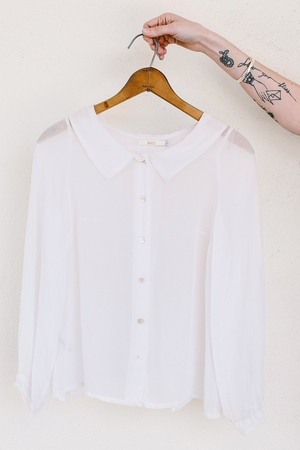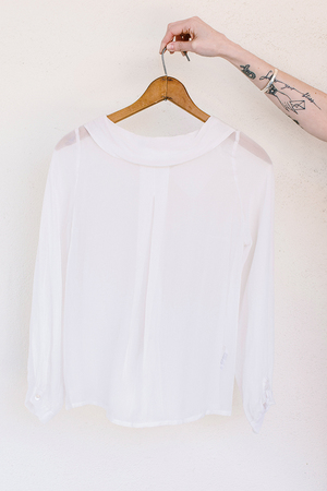 Delicate sheer blouse in a beautiful off-white silk georgette. Inverted box pleat gives a bit of interest and dimension to the back. 100% Silk. By Sula. ** sale items are final sale**