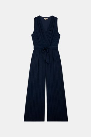 Satin jumpsuit with a sleeveless design and hemstitched satin stripes. It includes a tone-on-tone belt that ties at the side and a wide-leg silhouette. 100% Recycled Polyester. Imported.