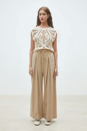 Two-tone crochet sleeveless jumper. Round collar. Sleeveless. 95% recycled polyester, 5% polyamide.